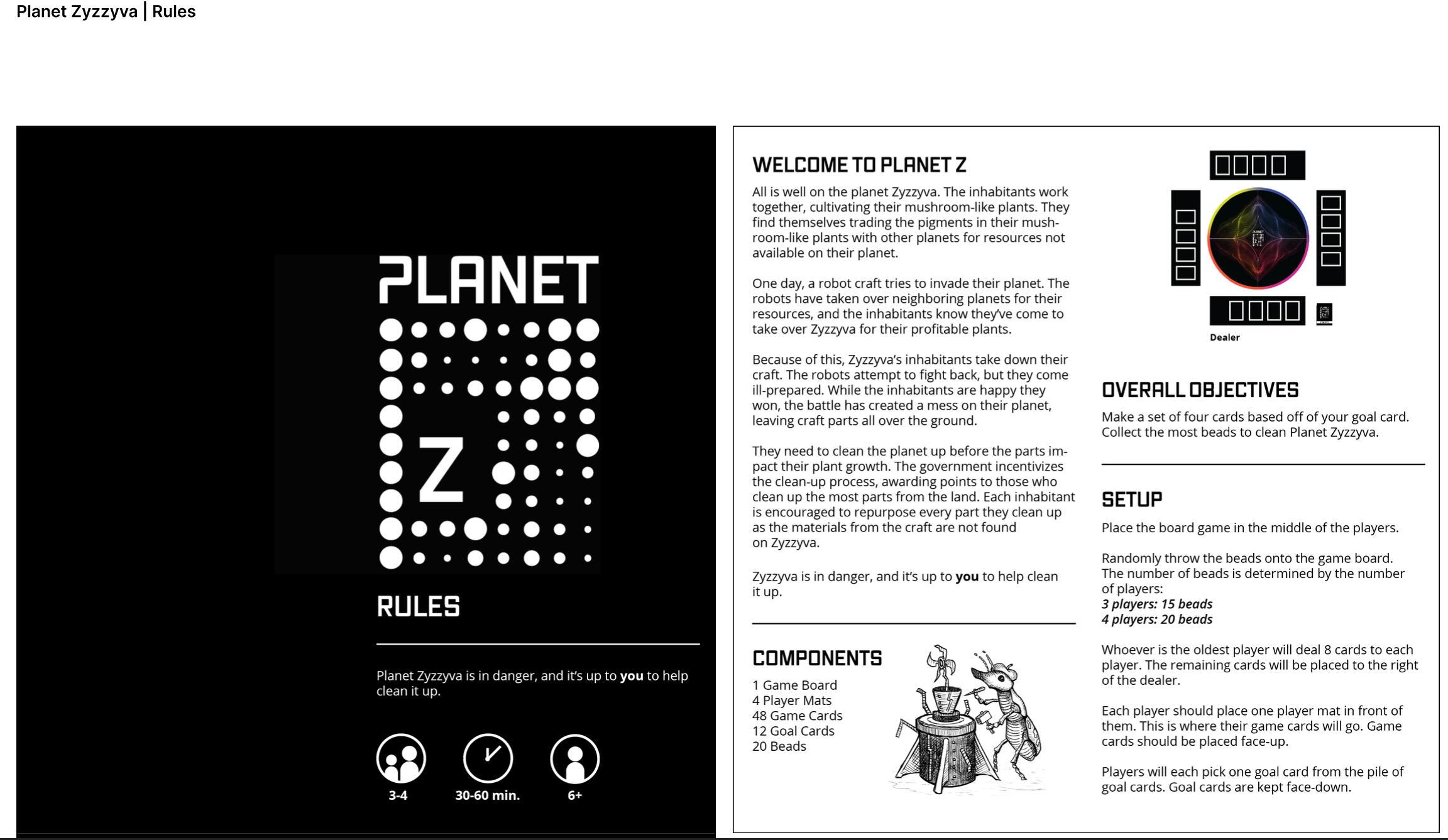 For Planet Z: The Game, I collaborated with designers and artists to produce a board game for 3-4 players. I helped create the concept, write the story and game play, make adjustments, and provide feedback on the design